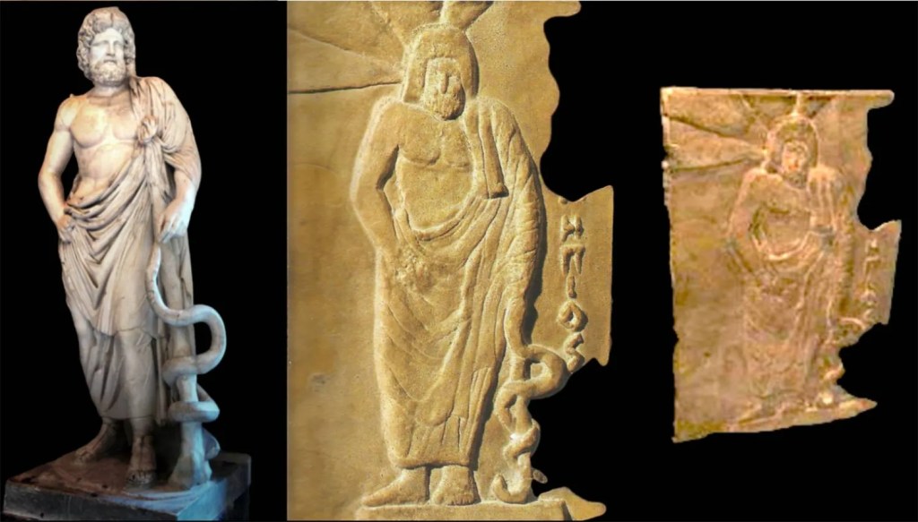 اسقيليبوس كما يظهر على لوح برونزي من البحرين يقابله تمثال من محفوظات متحف الآثار الوطني في أثينا